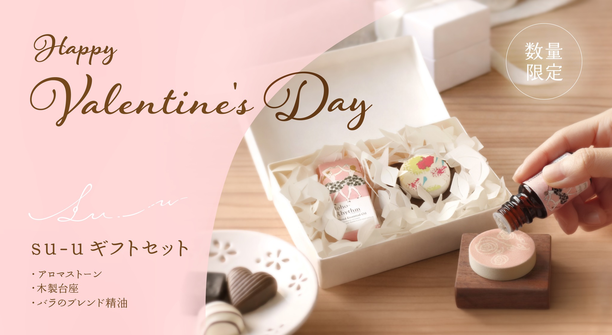 アロマストーン・木製台座・バラのブレンド精油をひと箱にまとめた、